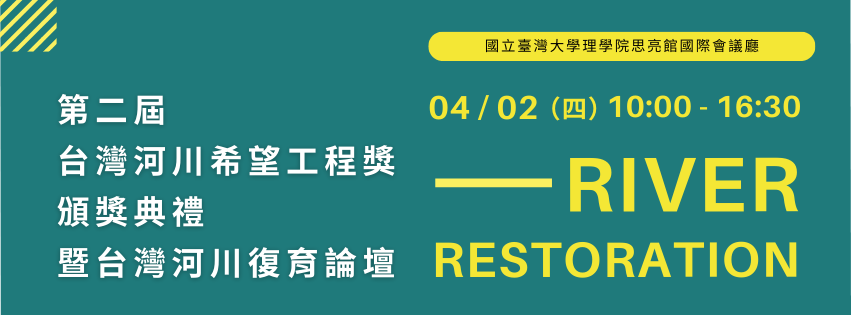 我們將於 2026 年 04 月 02 日(四)在 國立臺灣大學理學院思亮館國際會議廳,舉辦第二屆「 台灣河川希望工程頒獎典禮」暨「台灣河川復育論壇」,邀請大家共襄盛舉。